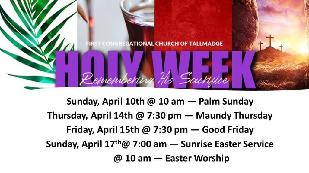 Join us at10am on Sunday, April 10th for our special Palm Sunday Service. Service will be available in person in our sanctuary, in our parking lot, and livestreamed on Facebook. The service will also be uploaded to our website later in the week. Hosanna! Come join us in the ‘Parade of Palms.”
