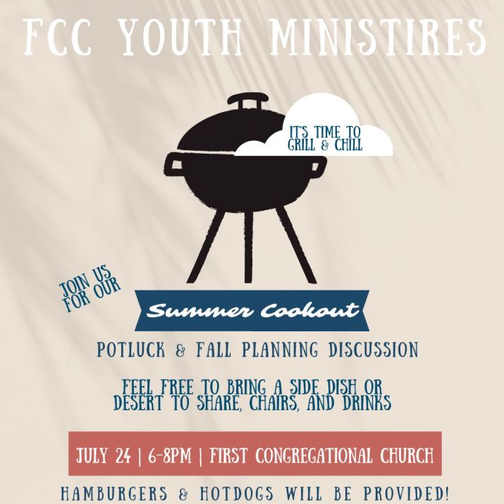 Our FCC Youth Group is back in session. Join us on Sunday, July 24th from 6-8pm for a summer cookout and planning session.
