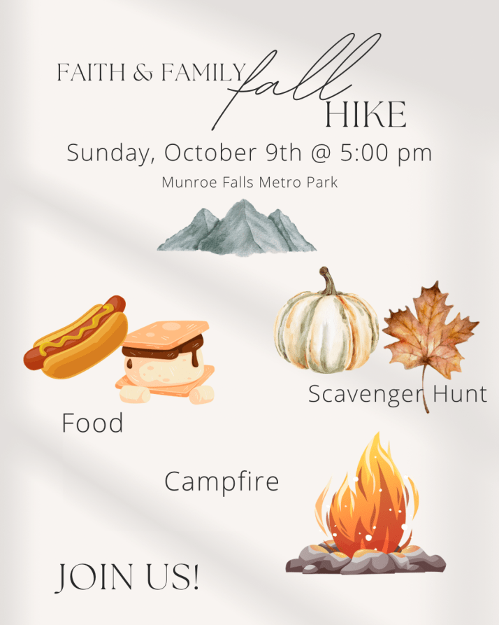 Faith and Family and the Youth group will be hosting a fall hike at Munroe Falls Metro Park on Oct. 9 at 5 pm. Come join us for a hike followed by dinner in the park. Please bring a side dish to share and drinks for your family. Hotdogs and place settings will be provided. If you can’t make it for the hike, please join us for dinner at 5:45pm. Sign up HERE!
