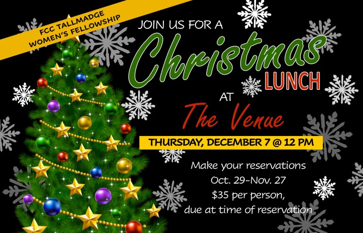 WOMEN’S FELLOWSHIP CHRISTMAS LUNCHEON by fcctallmadgeNovember 2, 2023December 11, 2023Leave a comment Get in the Christmas spirit and have a special lunch with your FCC family. This year our luncheon will be at The Venue on December 7 at 12 PM. All are invited to attend! Share this: Click to share on X (Opens in new window) X Click to share on Facebook (Opens in new window) Facebook Like Loading... Related