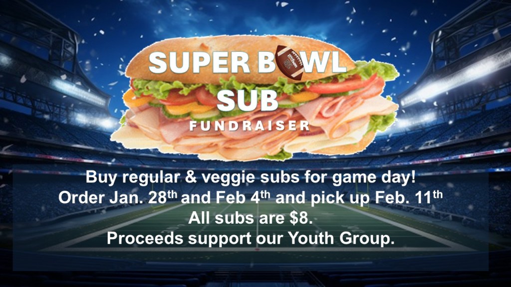 January 28 and February 4, Board of Christian Education and the youth group will be selling subs for you to enjoy during the Super Bowl game. We hope you will take part in supporting youth activities by purchasing a sub for you or someone else. This year, subs are $8.00. You can order regular or veggie. If you choose to order one for someone else, it will be delivered to one of our local missions. To order, you can stop in the Atrium on Jan. 28 or Feb. 4 or fill out the form below and return it by Feb. 4. Please plan on picking up your subs on February 11 by 11:30 AM.