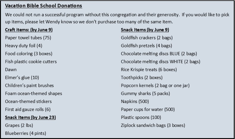Please consider donating craft and snack items for VBS. Most items are due by June 9. Read more for a full list of needed items.