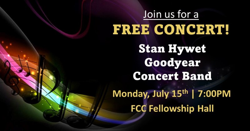 Monday, July 15th at 7pm, the Stan Hywet Goodyear Concert Band, under the direction of George Martin, will be presenting a one-hour musical performance in the Fellowship Hall.