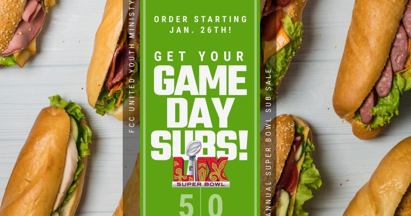 On January 26 and February 2, the Board of Christian Education and the youth group will be selling subs for you to enjoy during the Super Bowl game.