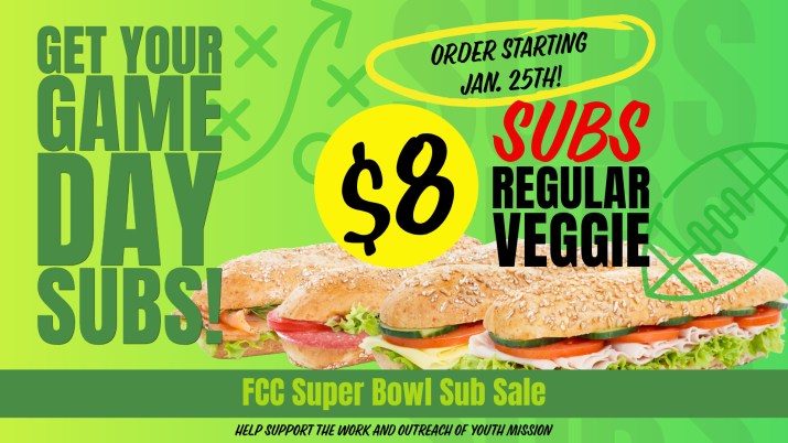 The big game is set, which means the FCC Annual Super Bowl Sub Sale is here! The Board of Christian Education and the youth of United Ministry will be selling subs for you to enjoy during the Super Bowl. Please consider supporting the work and outreach of our youth mission by purchasing a sub—or by donating one for someone else to enjoy! Cost is $8.00 per sub and choose between either a regular or veggie sub. If you choose to purchase a sub for someone else, it will be donated to one of our local mission partners.