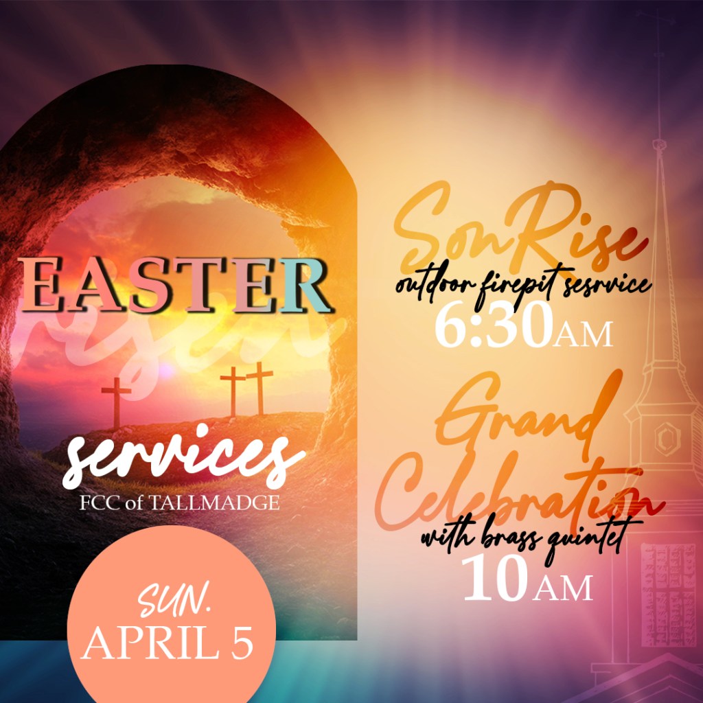Join your FCC Tallmadge family on Easter morning at 10:00 AM in our sanctuary for our Grand Celebration Worship Service. Our service will include prayer, scripture and special music, including a Brass Quintet. Hallelujah, He is risen! Come and celebrate with us!!
