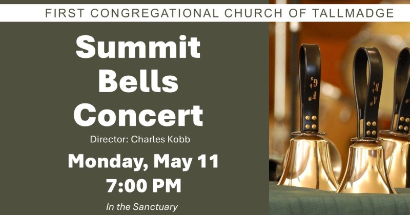 Monday, May 11th at 7pm, Summit Bells, under the direction of Chuck Kobb, will perform hymn arrangements, original handbell music, and a transcription of Bach organ work and a Scott Joplin rag.