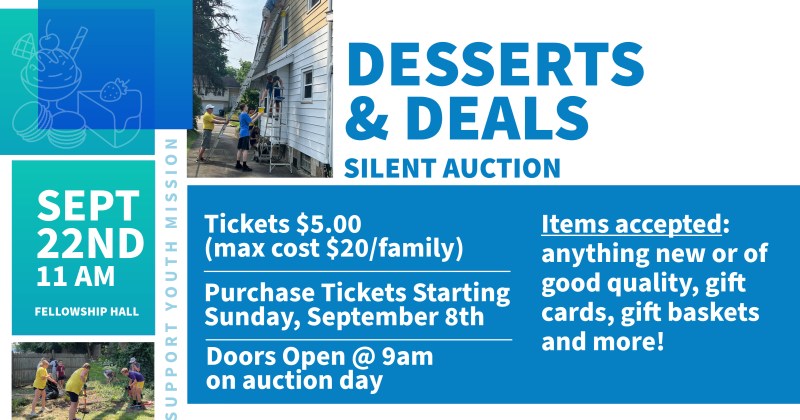Come support the youth of our church! We welcome you to take part in our Desserts and Deals silent auction on Sunday, September 22nd. Doors will open early at 9am for a sneak peak of the items available for bidding.…