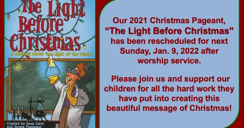 Our pageant has been rescheduled for Jan. 9, 2022 at 11am Our 2021 Christmas Pageant, The Light before Christmas by Dave Clark and Jayme Thompson, has been rescheduled for next Sunday, Jan. 9th, 2022 after worship at 11am. Please join us…
