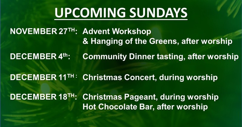 Sunday, December 15, during worship. Be sure to join us for worship on Sunday, December 15th at 10:00 AM. The children of the congregation will perform their pageant, "The Night Before Jesus," during worship. Please join us in the children's…