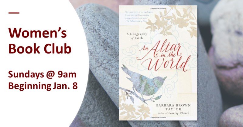 Women’s Book Club begins January 8 at 9 am in the David Bacon room. We are reading the book, An Altar in the World by Barbara Brown Taylor. We will read a chapter a week and finish by March 19. …